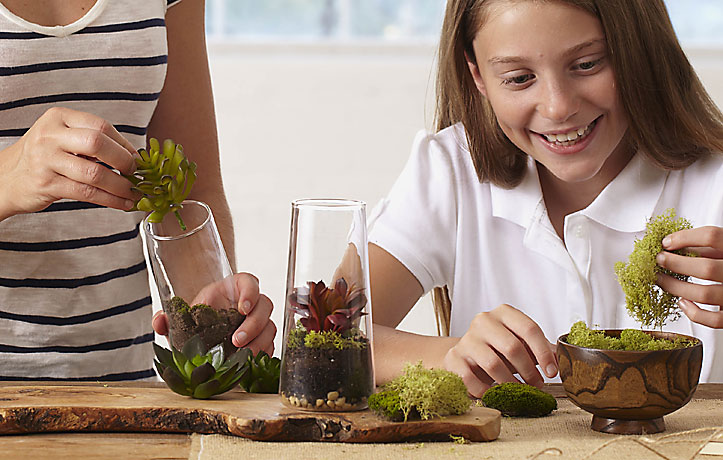 Place moss around the plant for added texture and interest (chopsticks work well for this step). Water lightly.